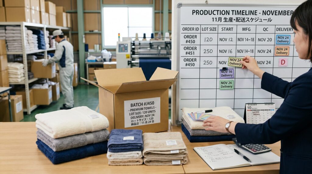 - 11月12日:仕様確定(タオル種類・色数・サイズ・梱包)